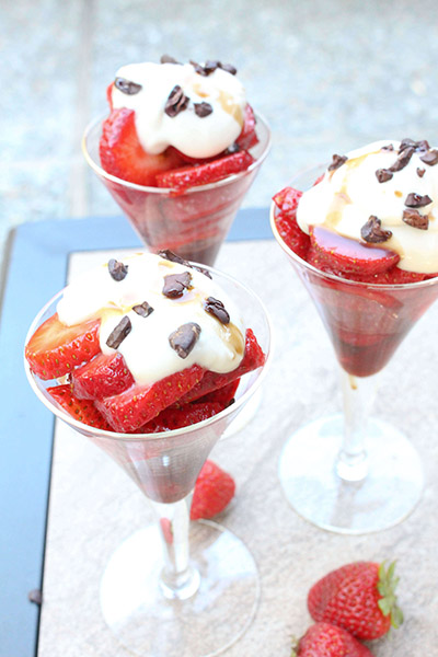 This dessert is one of my all-time favorite spring recipes. It is as light and refreshing as the season itself, and is the perfect way to end a spring meal. Juicy fresh strawberries are sliced up and marinated in a sweet chocolate balsamic sauce for a few minutes before serving. They are then layered in a glass and topped with light and fluffy coconut whipped cream and toasted cacao nibs for crunch. This dessert is nearly effort free and sure to impress!