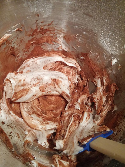 Add the chocolate: Sprinkle the cocoa, vinegar and then the chopped chocolate over the egg whites. Gently fold everything with a rubber spatula until the cocoa is thoroughly mixed in.
