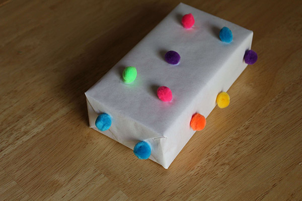 After wrapping the gifts in white kraft paper I used my hot glue gun to dab glue on the paper and the boys used some pom poms to decorate the packaging.