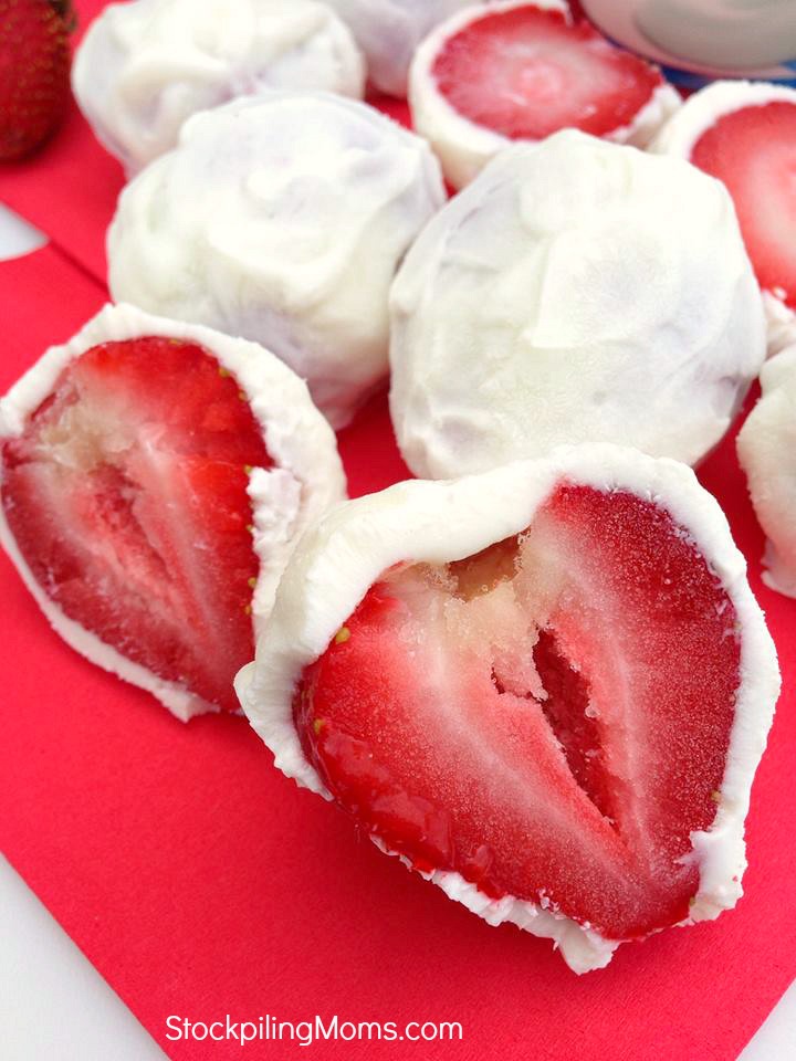 This is so easy and perfect for the hot days of summer! Cut the strawberries in half, dip in yogurt, put on a cookie sheet, pop in the freezer for 2 hours. Love this easy how-to from Stockpiling Moms.