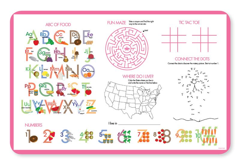 The Personalized Placemats for Kids feature a fun back design that includes a colorful ABC with foods by the letter, the numbers from 1 to 10, and little games like tic tac toe and connect the dots.